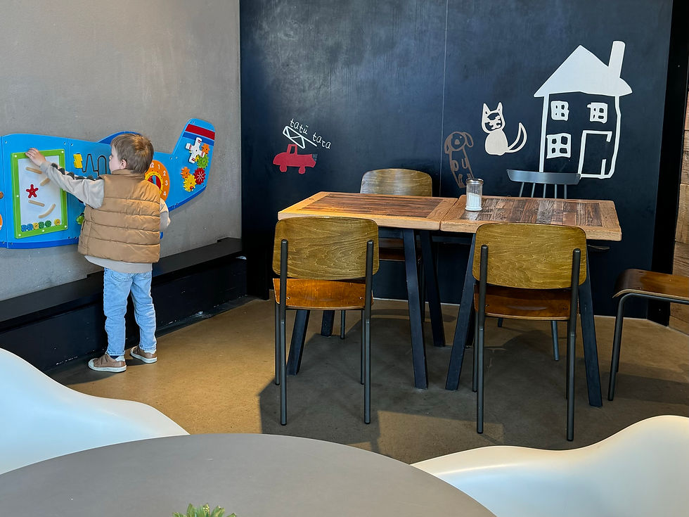 Im hinteren Bereich dieser Kistenpfennig Filiale in Garching, nördlich von München, gibt es hier eine kleine Wand mit einigen Spielmöglichkeiten.